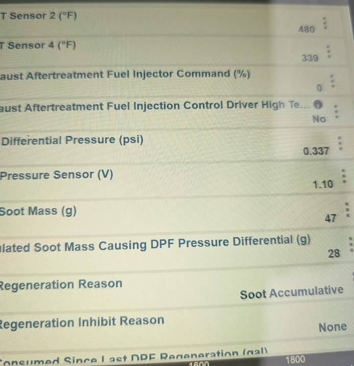 With our scan tool connected, we looked at the live data from the engine's computer. We immediately noticed that the diesel particulate filter (DPF) had a soot load of 47 grams. This is an extremely high level of soot, well beyond the normal threshold. This finding told us the system was not cleaning itself effectively.